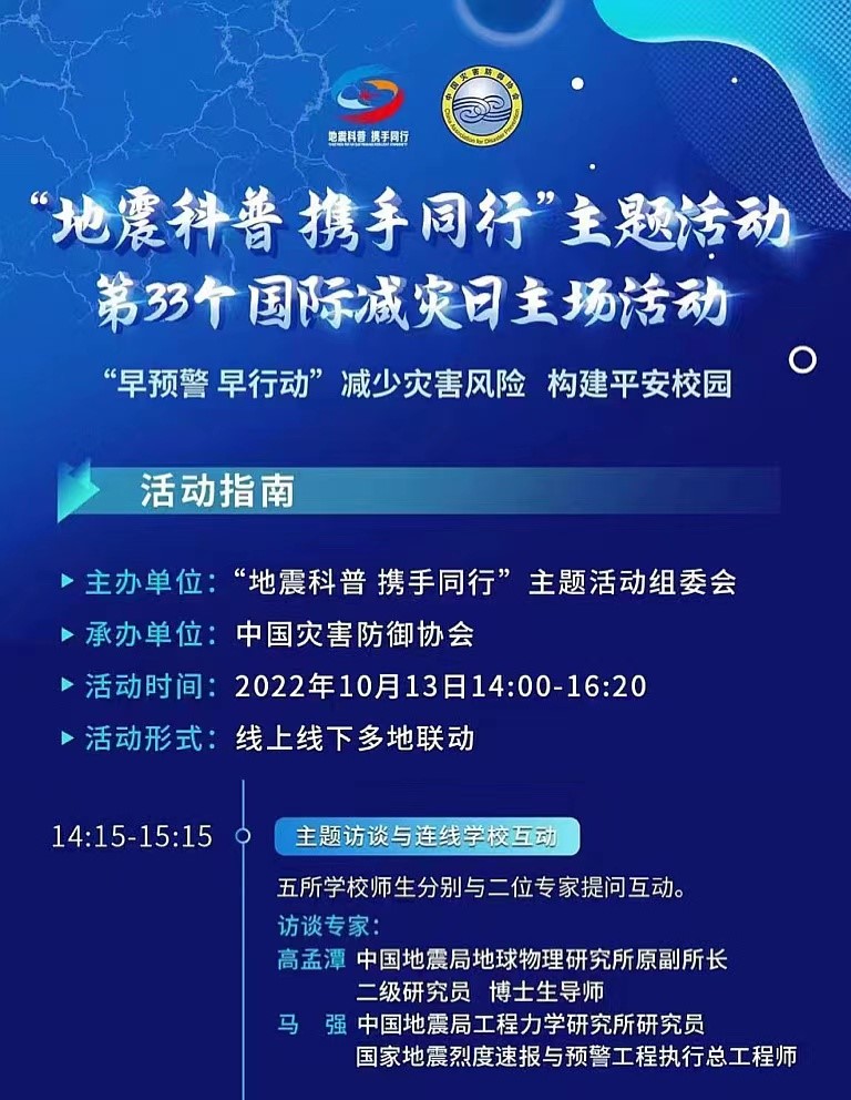 一是我所馬強研究員受邀參加中國災害防御協會組織的“地震科普 攜手同行”主題直播活動。線上訪談期間,馬強研究員就怎樣獲得預警信號,接收預警信號后如何做;如何減輕地震風險,建設更安全校園;山區學校師生如何開展應急避險;高樓避險有何不同等社會關切問題進行了細致解答,各平臺直播和回放總量已超800萬次。