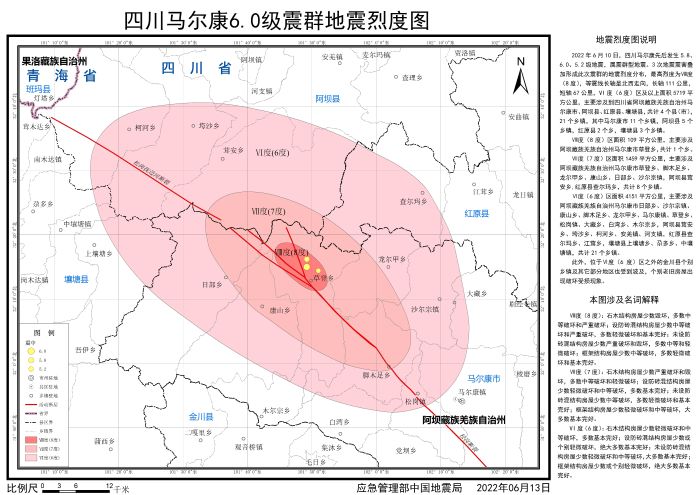 發(fā)布時(shí)間: 2022-06-22 點(diǎn)擊數(shù)量:46422022年6月10日,四川阿壩州馬爾康市先后發(fā)生5.8、6.0、5.2級地震,屬震群型地震。地震發(fā)生后,按照應(yīng)急管理部部署,中國地震局組織四川省地震局開展應(yīng)急處置工作,依照《地震現(xiàn)場工作 第3部分:調(diào)查規(guī)范》(GB/T 18208.3-2011)、《中國地震烈度表》(GB/T 17742-2020),通過災(zāi)區(qū)震害調(diào)查,并綜合應(yīng)用儀器烈度、地震構(gòu)造背景、余震分布、震源機(jī)制、遙感影像等科技支撐成果,確定了此次地震的烈度分布,并依照《地震烈度圖制圖規(guī)范》(GB/T 38226-2019)編制完成《四川馬爾康6.0級震群地震烈度圖》。