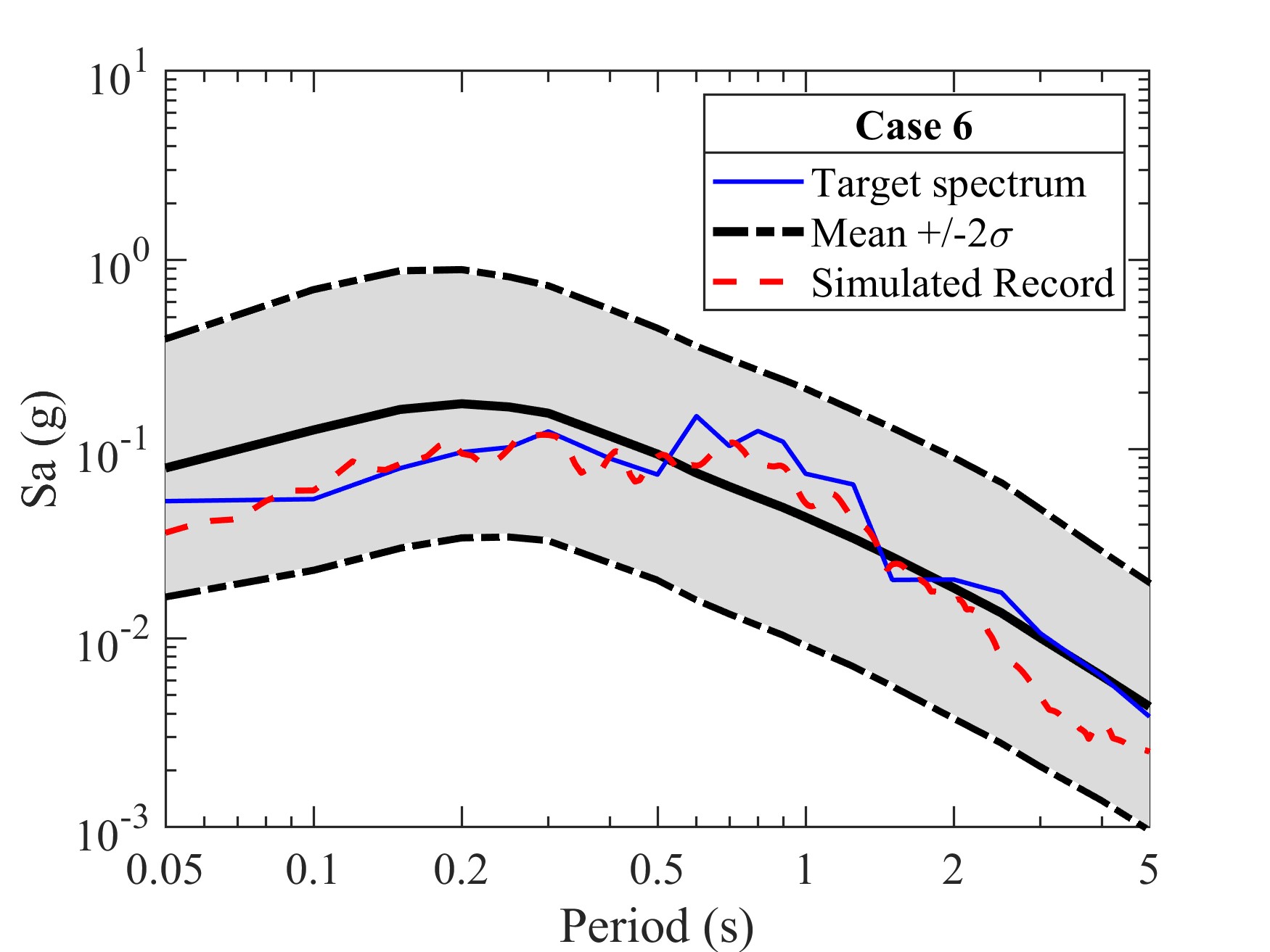 以日本關東為目標區域,具體應用了本文的地震動模擬程序。基于目標矢量強度指標的多元正態分布,由拉丁超立方抽樣(LHS)給出了目標多強度指標(見圖2)。由GMSP生成的11條模擬地震動記錄計算得到了多強度指標的模擬值(見圖3)。從圖中可以看出,模擬反應譜的譜值都分布在目標均值譜兩倍標準差范圍內,且非頻譜參數的模擬值與目標值分布也基本一致。圖4中給出了算例6中地震動記錄詳細的模擬結果。這些模擬結果表明:該地震動模擬程序能夠實現對于地震動幅值、頻譜、持時和累積能量的協調匹配,可以為結構動力分析提供合理的輸入。